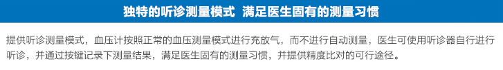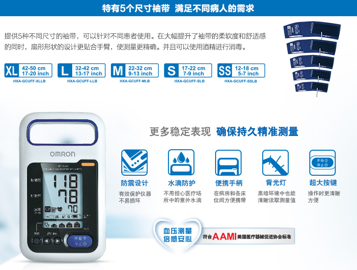 独特的听诊模式 专业耐久设计 特有5个尺寸袖带 通过AAMI(美国医疗器械促进协会)准确性检测标准本体重量:本体约0.52kg 电池约0.1kg 外形尺寸:123(宽)×201(高)×99(厚)mm