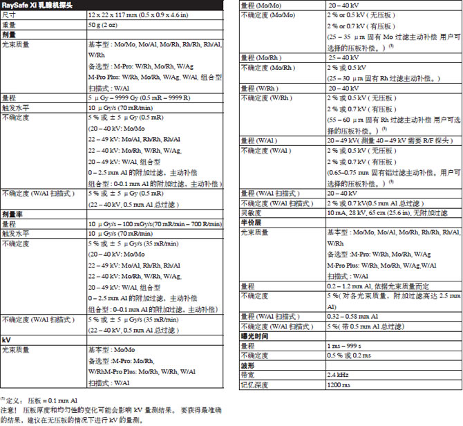 乳腺探头 RaySafe Xi MAM探头除了具有处理普通球管老化影响的独特功能外,还可直接测量每次曝光的HVL,而无需滤片和多次曝光。对于特定光束质量,例如,Mo/Mo、Mo/Rh、W/A1、W/Rh和W/Ag,我们的解决方案为用户提供可追溯的校准,使RaySafe Xi成为模拟和数字化乳腺X射线设备的理想选择。它甚至还可测量不同线束和扫描式组合的乳腺机。乳腺探头同时适用于低剂量率和高剂量率乳腺X线机。